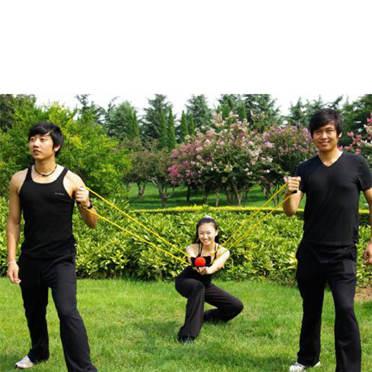Два игрока находятся в трех футах друг от друга, и каждый захватывает одну из виниловых ручек своей внутренней рукой.
